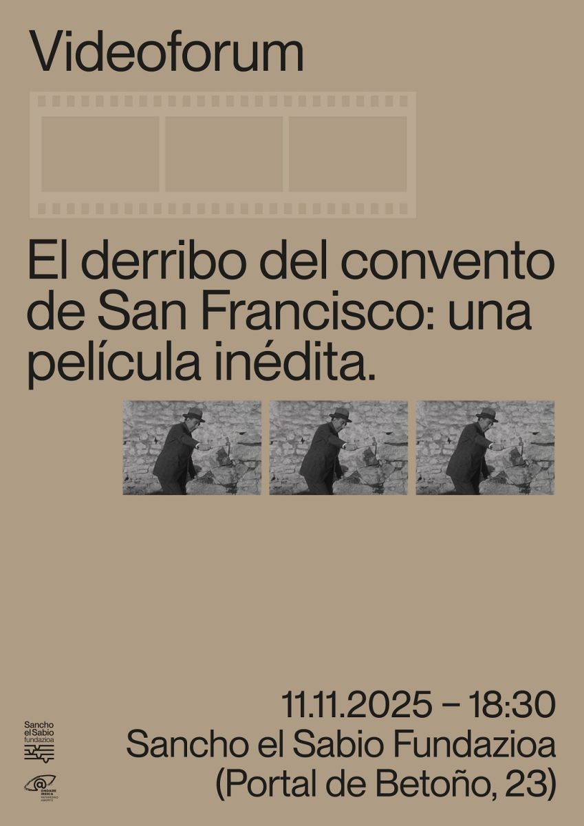 La Fundación Sancho el Sabio Vital presenta, en colaboración con Ondare Irekia, una grabación encontrada en el archivo de la Fundación, inédita, restaurada y digitalizada, que muestra el acto del polémico derribo y destrucción del Convento de San Francisco. La proyección de la película estará dinamizada por Isabel Mellen y Gorka López de Munain, que repasarán la historia del templo desde su fundación medieval hasta el siglo XX, y hablarán de los motivos que llevaron a su incomprensible destrucción, un acto que condenó al olvido no solo al edificio, sino también a todo lo que ocurrió dentro de sus muros. Esta charla será una oportunidad para reflexionar sobre la relación de las instituciones con el patrimonio y la responsabilidad colectiva en su conservación, y sobre el necesario trabajo de archivo para la recreación de la memoria histórico-local de Vitoria y Álava.