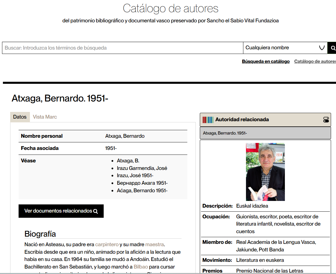 Sancho el Sabio Vital Fundazioak bere egileen katalogoa aurkeztu du, ondare bibliografiko eta dokumentalaren katalogo orokorra kontsultatzeko modu berria. Edonork "Egileen katalogoa" aukeratik sartu ahal izango du bilaketa-koadroan eta Sancho el Sabio Vital Fundazioan egile horri buruz gordetako eta kontserbatutako lan guztiak ezagutu ahal izango ditu. Egile-fitxak, pertsona- eta erakunde-izenen autoritateak, Wikipediatik eta Wikidatatik datorren informazioarekin aberastuta daude, eta autoritateen beste datu-biltegi batzuetarako estekak ahalbidetzen dituzte, hala nola Espainiako Liburutegi Nazionalerako edo VIAFerako.